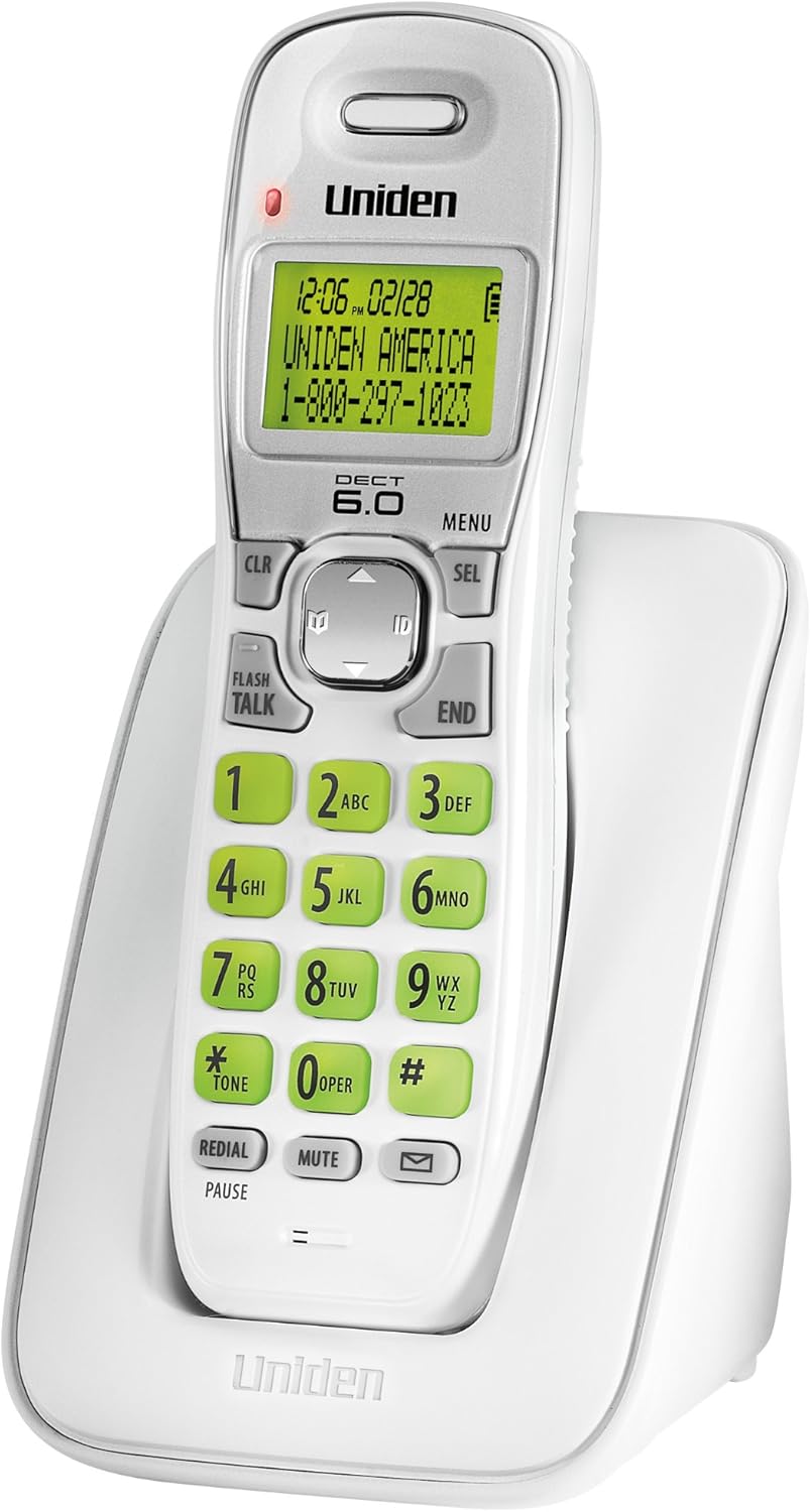 รูปที่ 1: Uniden DECT 6.0 Cordless Phone D1364. This image shows the white cordless handset resting in its charging base. The handset features a green backlit LCD display showing time, date, and a sample caller ID entry. The keypad has large, green-backlit buttons for dialing and function keys like CLR, MENU, SEL, FLASH/TALK, END, REDIAL/PAUSE, MUTE, and a message indicator.
