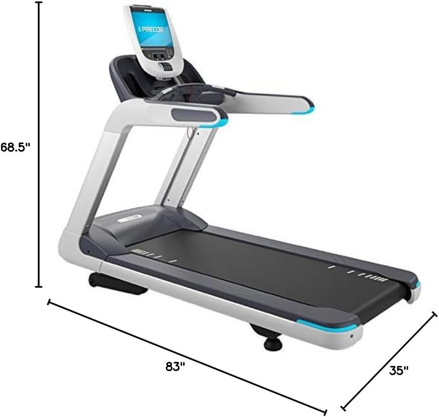 Image: Precor TRM 885 Treadmill with its dimensions. The treadmill measures approximately 83 inches in depth, 35 inches in width, and 68.5 inches in height.