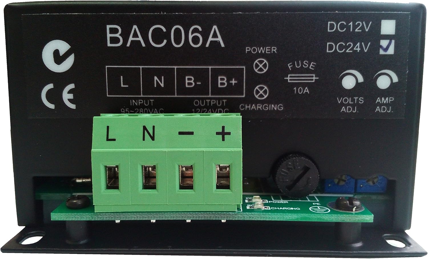 The BAC06A-24V charger features a robust design with clearly labeled terminals and indicators for ease of use and installation.