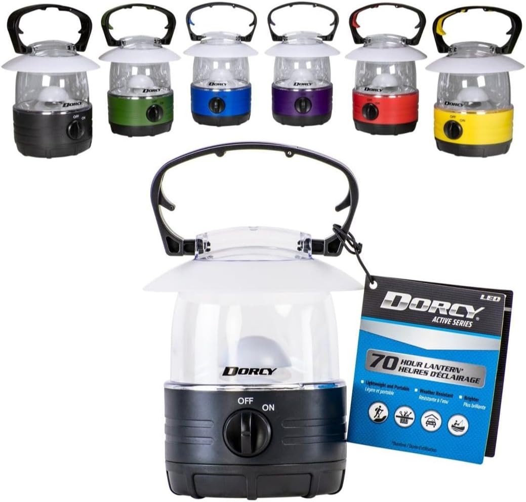 Image 1.1: Assorted Dorcy 40 Lumens LED Lanterns in various colors, including black, green, blue, purple, red, and yellow. One lantern is shown with its retail packaging, highlighting its 70-hour run time and LED technology.