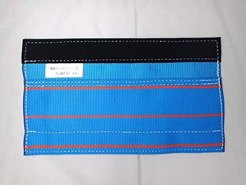 Image: The NT S&P Protection Pad TC1-50. This blue rectangular pad is designed to protect corners during lifting. It has a black top edge with white stitching, and the main blue body features horizontal orange lines and white dashed stitching. A small white label with product details in Japanese is visible on the top left.