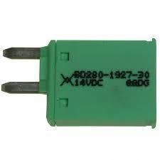 Figure 1: Littelfuse BD280-1927-30/16-W Resettable Blade Fuse. An image showing the green Littelfuse BD280-1927-30/16-W resettable blade fuse with two metal prongs extending from one end. The fuse body is rectangular and green, with model numbers and voltage ratings printed on its surface.