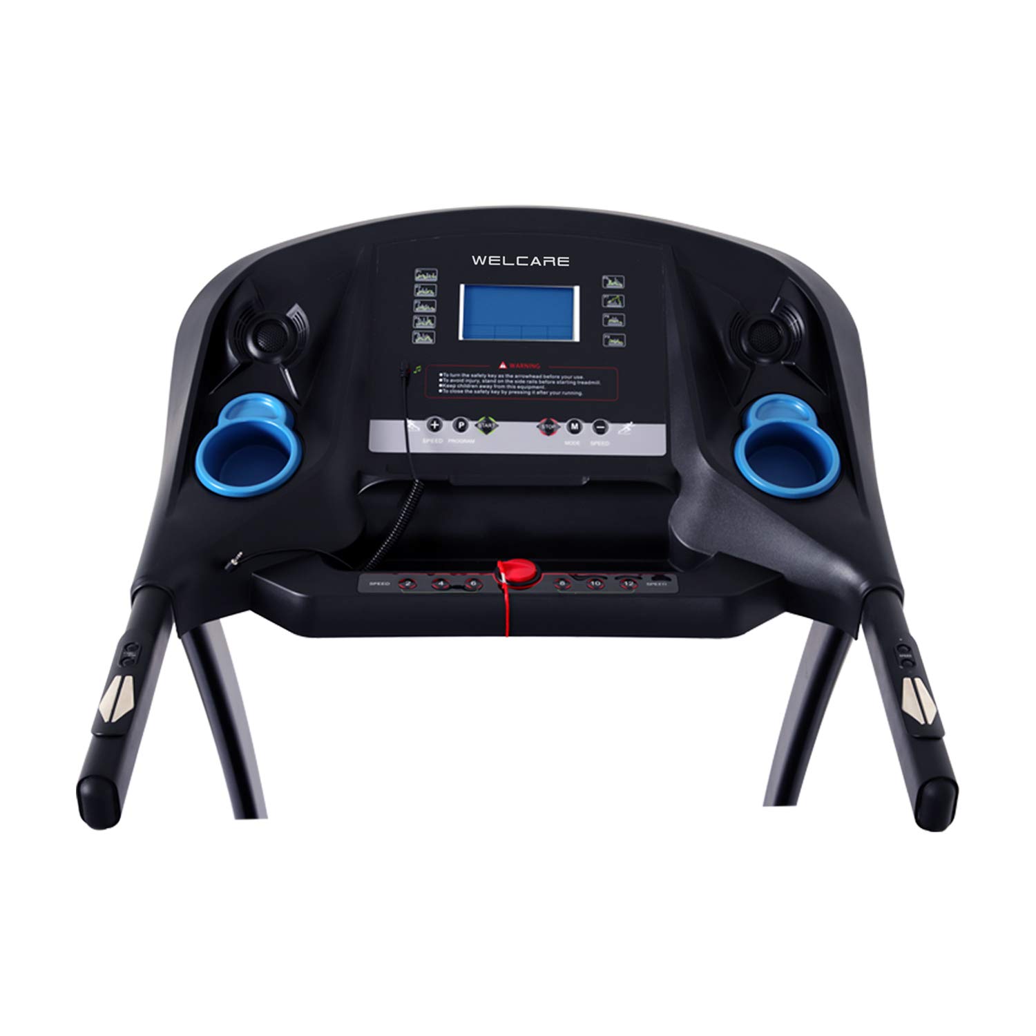 Image: The main console of the WELCARE WC2288I treadmill, featuring an LCD display, various control buttons for speed and incline, and integrated cup holders.