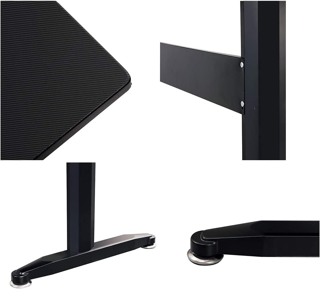 รูปที่ 3.1: รายละเอียด view of the desk's carbon fiber textured surface, sturdy frame connection, and adjustable leveling feet for stability.