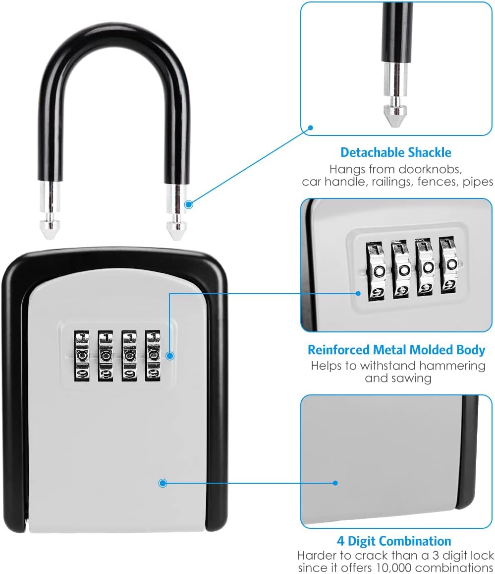 - Removable Shackle: The lock box features a detachable shackle, allowing it to be easily hung on doorknobs, car handles, railings, fences, or pipes without the need for tools.