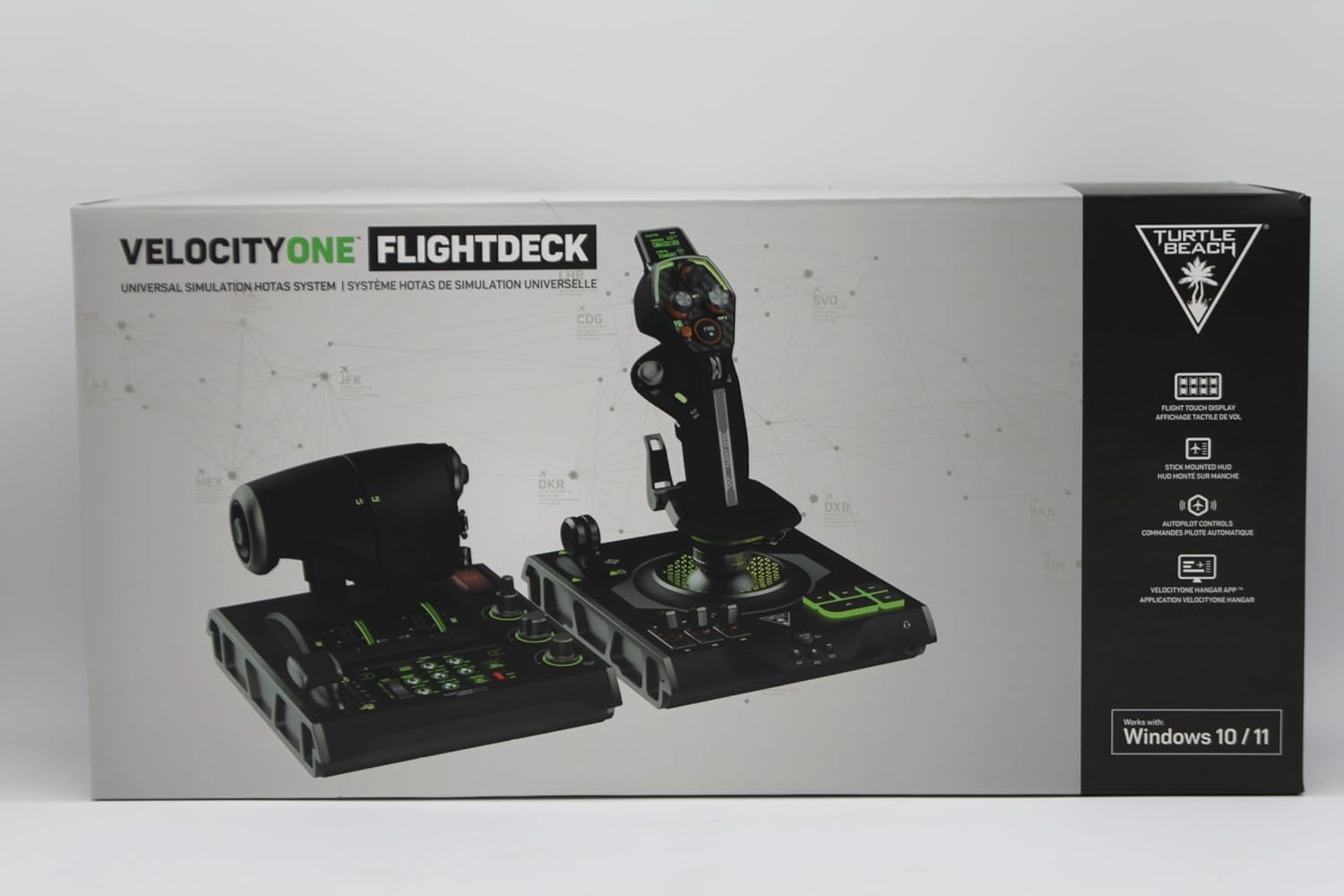 The Turtle Beach VelocityOne Flightdeck is a premium HOTAS simulation system for Windows 10 & 11 PCs, engineered to deliver enhanced immersion for sim enthusiasts who demand the best. Inspired by state-of-the-art jet fighters and advanced spacecraft, it provides a ground-breaking HOTAS experience designed for all major flight simulation titles. It features comprehensive controls including 15 axes and 139 programmable functions, a Flight Touch Display, and an OLED Head Up Display for performance optimization and customization. The Flight Hangar app for desktop offers further in-depth customization, including RGB lighting zones.