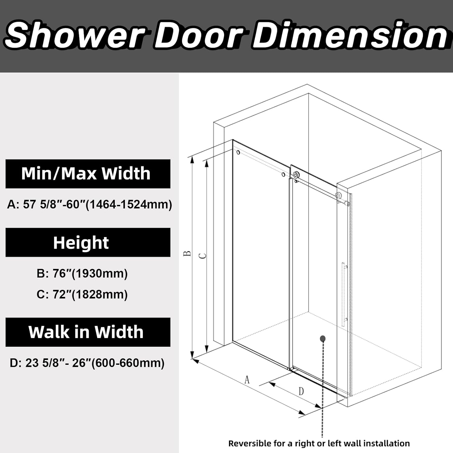 Image: Technical diagram illustrating the adjustable width (57 5/8" - 60"), height (76"), and walk-in width (23 5/8" - 26") of the shower door, also indicating reversible installation.
