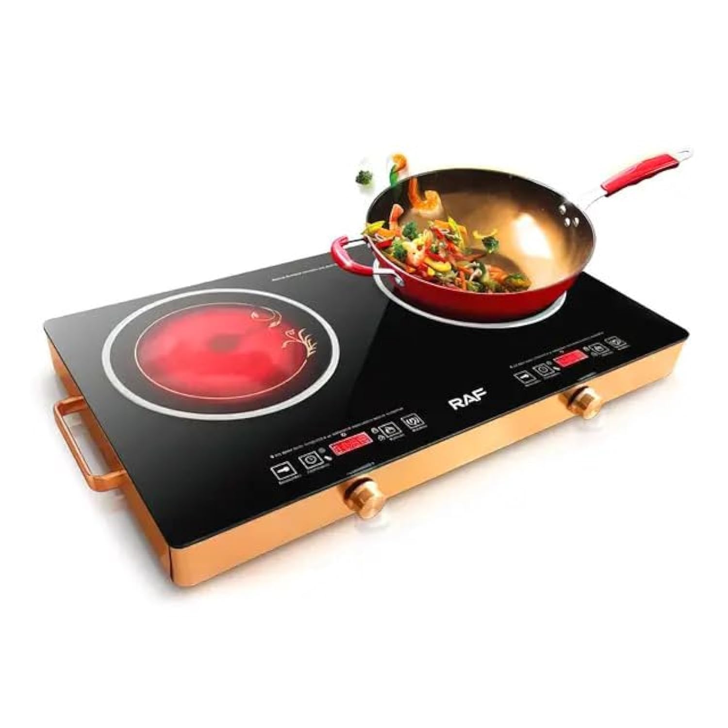 The RAF R.8088 is a compact and lightweight 2-burner electric heating plate designed for efficient cooking. It features two radiant heating elements controlled by individual knobs.