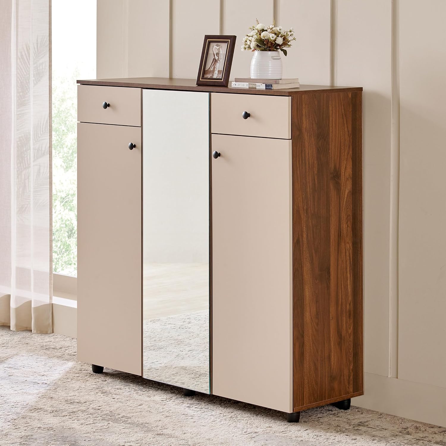 The Home Centre Addison Shoe Cabinet is designed for organized shoe storage and entryway functionality. It features a 3-door design, including a central mirrored door, and two integrated drawers for additional storage. The cabinet is constructed from prelaminated engineered wood with a walnut finish.