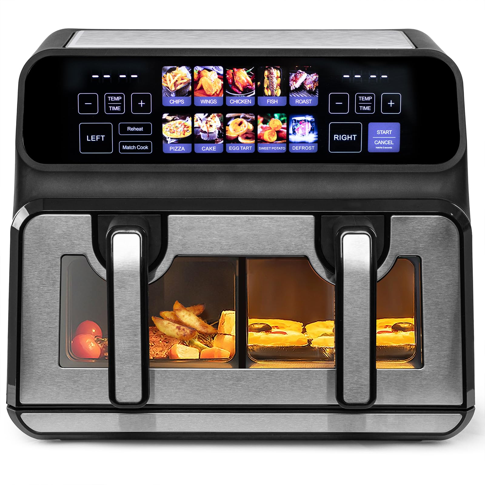 The air fryer features an intuitive inclined color touch screen. It displays temperature, time, and various cooking programs. There are separate controls for the left and right baskets, along with a 'Match Cook' function for synchronous cooking.