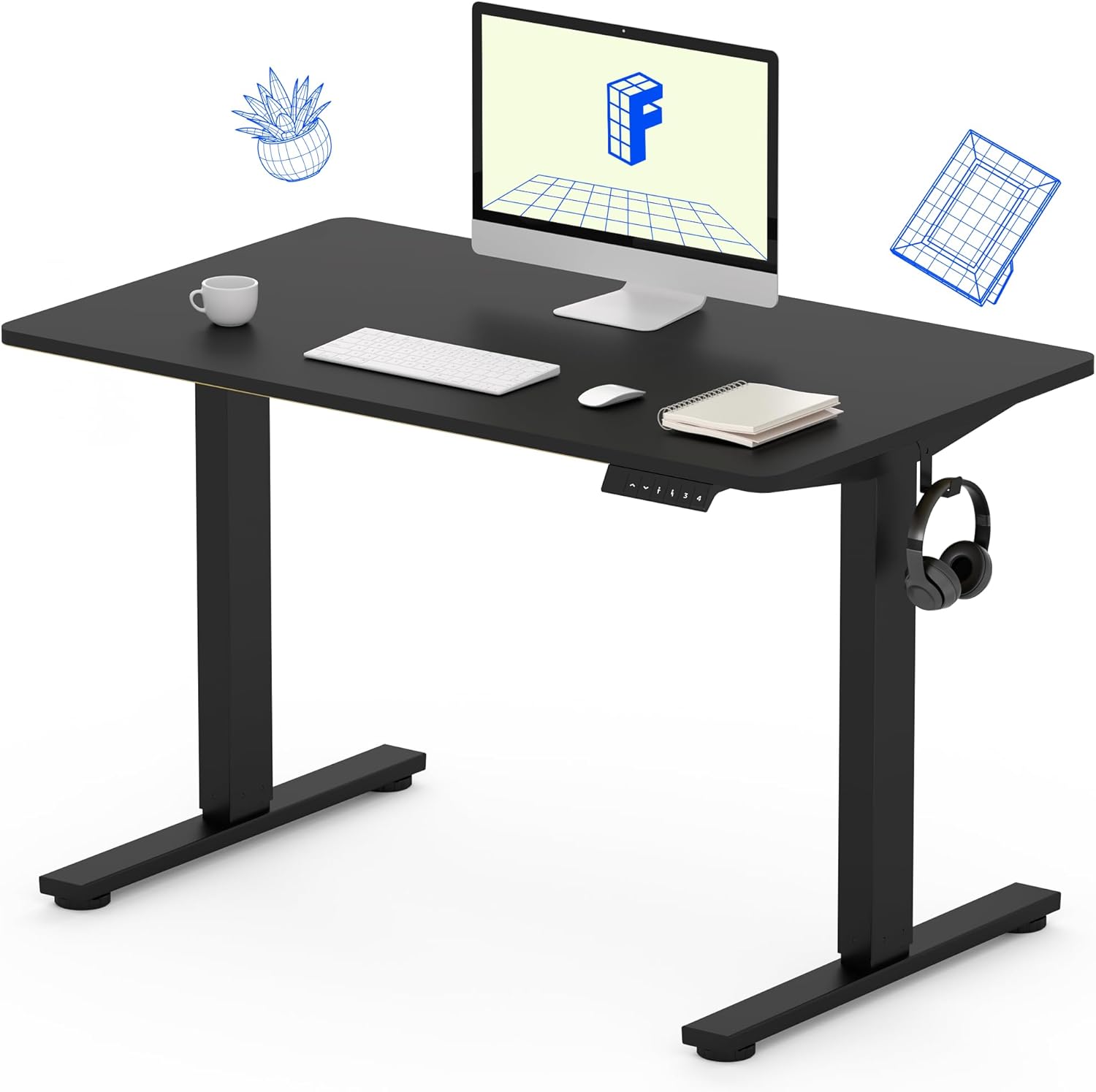 Image 1: The FLEXISPOT Standing Desk, showcasing its black desktop, black frame, and integrated control panel with a headphone hook.